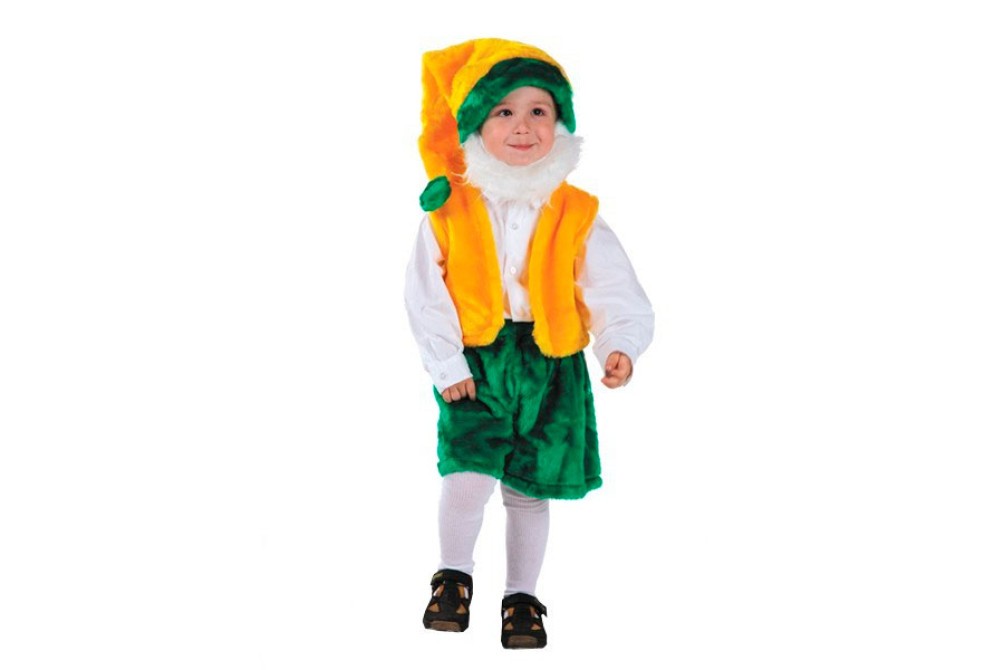 Все элементы костюма выполнены из качественного искусственного меха ярких расцветок, в таких цветах как желтый и зеленый. Жилетка желтого цвета, шорты-зеленые, колпак очень интересно и забавно дополняет костюм гнома, так же в комплект входит борода.