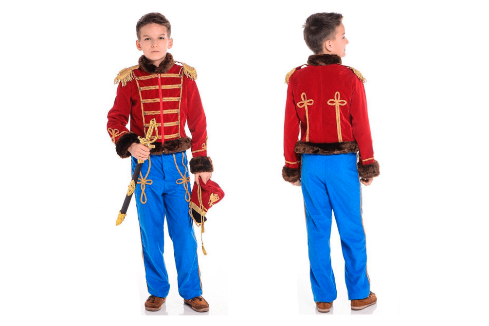 Детский маскарадный костюм "Гусарский офицер" - 2 - это оригинальный красивый мужественный наряд для пока маленького мужчины и защитника, который подойдет к любому празднику, запомнится всем гостям и приведет в восторг Вашего малыша. Наряд бравого героя состоит из красного доломана, расшитого золотом, белых рейтуз с золотыми полосками и высокого кивера. Мальчик долго не отойдет от зеркала, а потом еще долго будет играть в Дениса Давыдова. Вы будете рады видеть своего малыша счастливым.