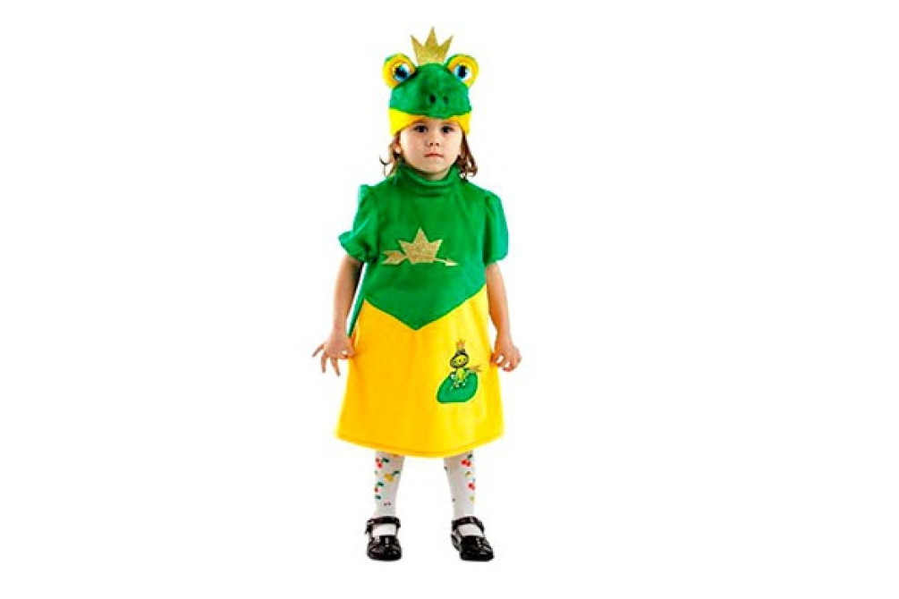 Детский карнавальный костюм Царевна-лягушка, в комплект которого входит сарафан из плюшевой ткани и шапочка в виде лягушки с короной.