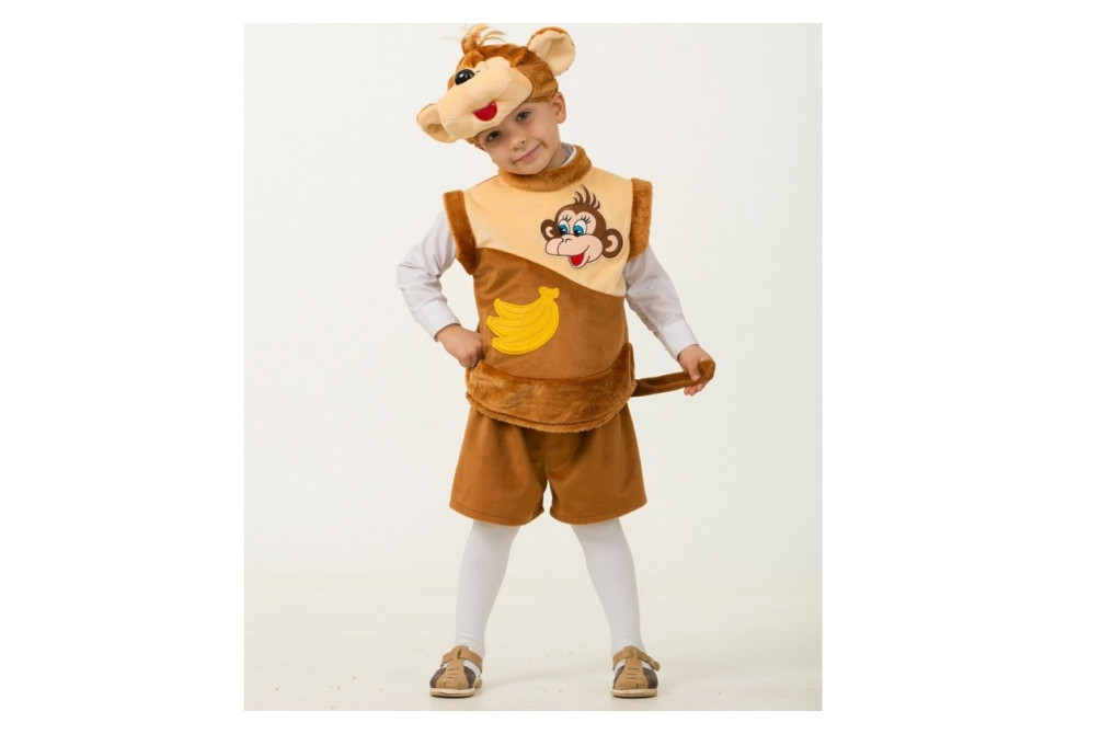 В комплект наряда «Обезьянчик Тинки» входит маска, выполненная в виде головы обезьянки, жилетка и шортики.