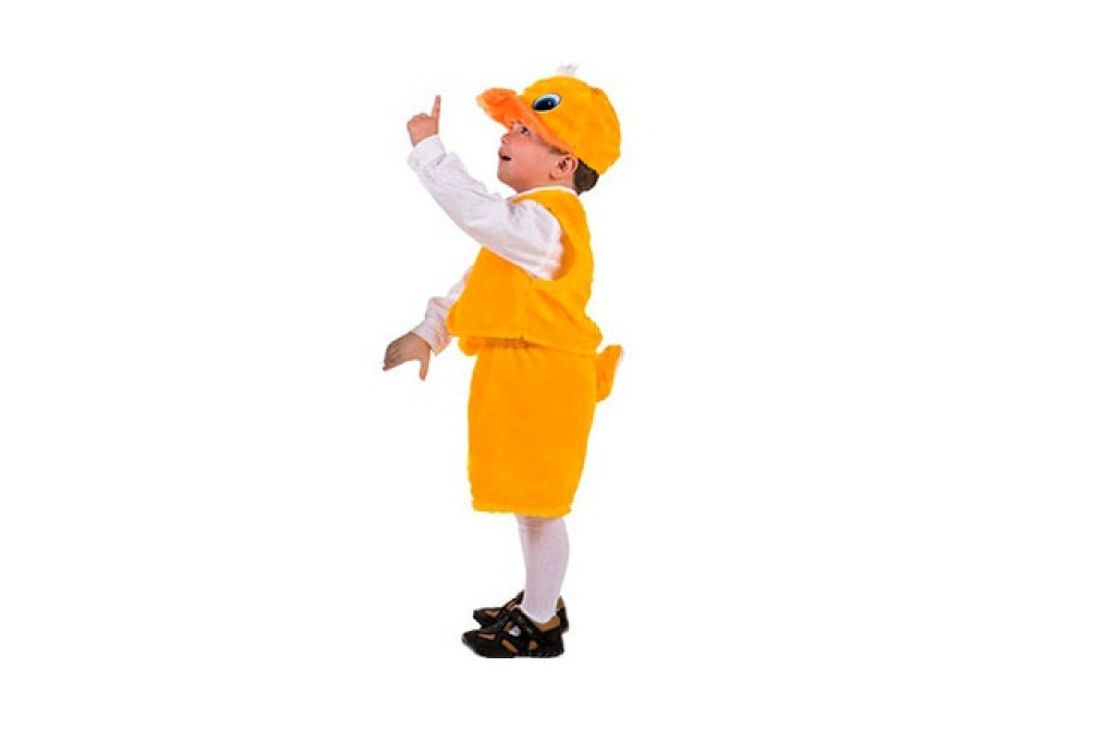 Карнавальный костюм укомплектован объемными шортиками, жилетом и шапочкой в виде головы утенка.