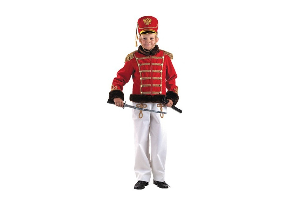 Детский маскарадный костюм «Гусарский офицер» — это оригинальный красивый мужественный наряд для пока маленького мужчины и защитника, который подойдет к любому празднику, запомнится всем гостям и приведет в восторг Вашего малыша. Наряд бравого героя состоит из красного доломана, расшитого золотом, белых рейтуз с золотыми полосками и высокого кивера. Мальчик долго не отойдет от зеркала, а потом еще долго будет играть в Дениса Давыдова. Вы будете рады видеть своего малыша счастливым.