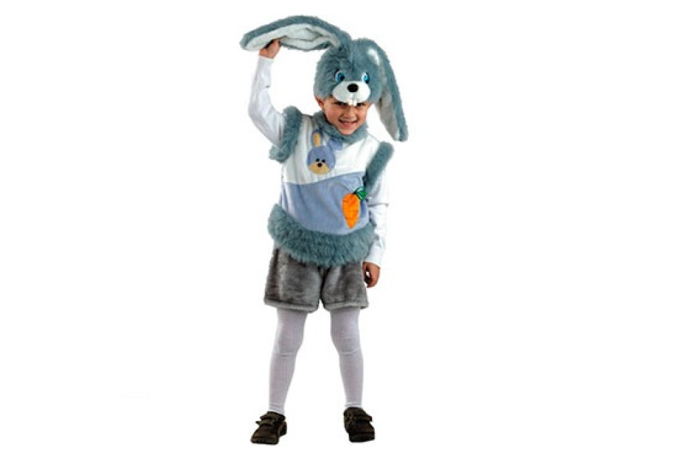 Трогательный детский карнавальный костюм «Кролик Длинноухий» обязательно Вам понравится – бело-голубой жилет с аппликацией и меховой оторочкой, серые шорты, очень удобные и приятные на ощупь, и шапка-маска искусственного меха, с трогательными ушками — прекрасное сочетание красоты и удобства.