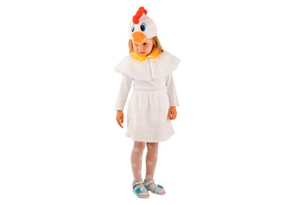 Белая юбочка искусственного меха, белая кофточка-накидка, украшенная ярким желтым воротником и шапочка-маска с клювом и гребешком – отличный вариант и для Дня Рождения, и для утренника, и для тематического праздника.