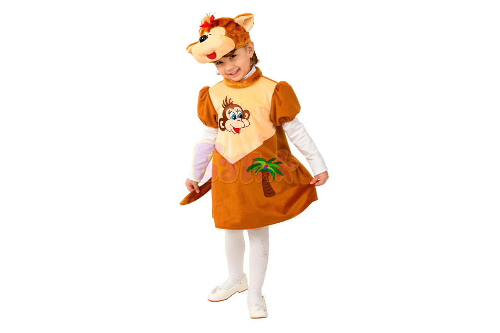 В комплект костюма Обезьянка входит плюшевая маска в виде мордочки забавной обезьянки и сарафан, украшенный пальмой и мордочкой обезьянка.