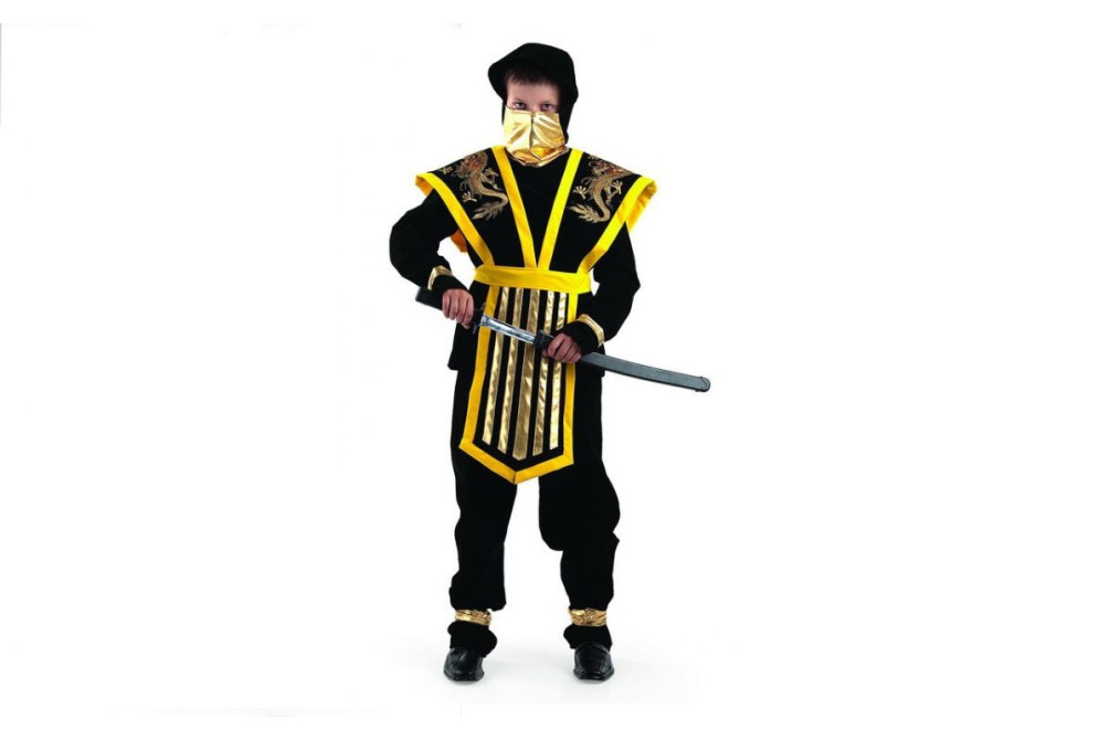 Что главное в детском новогоднем костюме? Конечно игра, которую сочинит Ваш неутомимый ребенок. Так сделайте ему подарок, дайте почувствовать себя героем-ниньзя без страха и упрека. Черны детский карнавальный костюм с расшитым золотом коротким кимоно, золотой маской и японскими драконами на плечах красив и изящен. В комплекте идет самурайский меч в красочных ножнах, без которого никак не обойтись настоящему герою. В этом костюме Ваш сын безусловно станет главным персонажем на празднике.