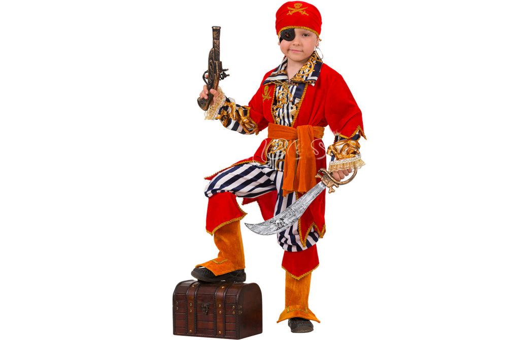 Детский маскарадный костюм "Пират морской" - это красивый элегантный наряд романтического героя. Он создан для Вашего юного мужчины, с учетом подвижности и особенностей детской фигуры. Он подойдет к любому празднику, запомнится всем гостям и приведет в восторг Вашего сына. Наряд героя романов о капитане Бладе или Моргане, смелом, бесстрашном, находчивом завоевателе сокровищ далеких островов состоит из красного камзола, подпоясанного широким поясом, рубахи на шнуровке с широкополым воротничком, расшитым золотом, широких брюк, затейливых высоких сапог, лихо повязанной банданы и набора оружия. Мальчик легко вживется образ красавца пирата. Вы будете рады видеть своего малыша счастливым.