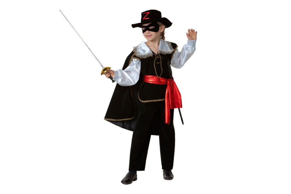Черный карнавальный костюм с маской на глаза, брюками, широкополой шляпой, плащом, алым кушаком, поверх черного жилета, на шнуровке красив и изящен.