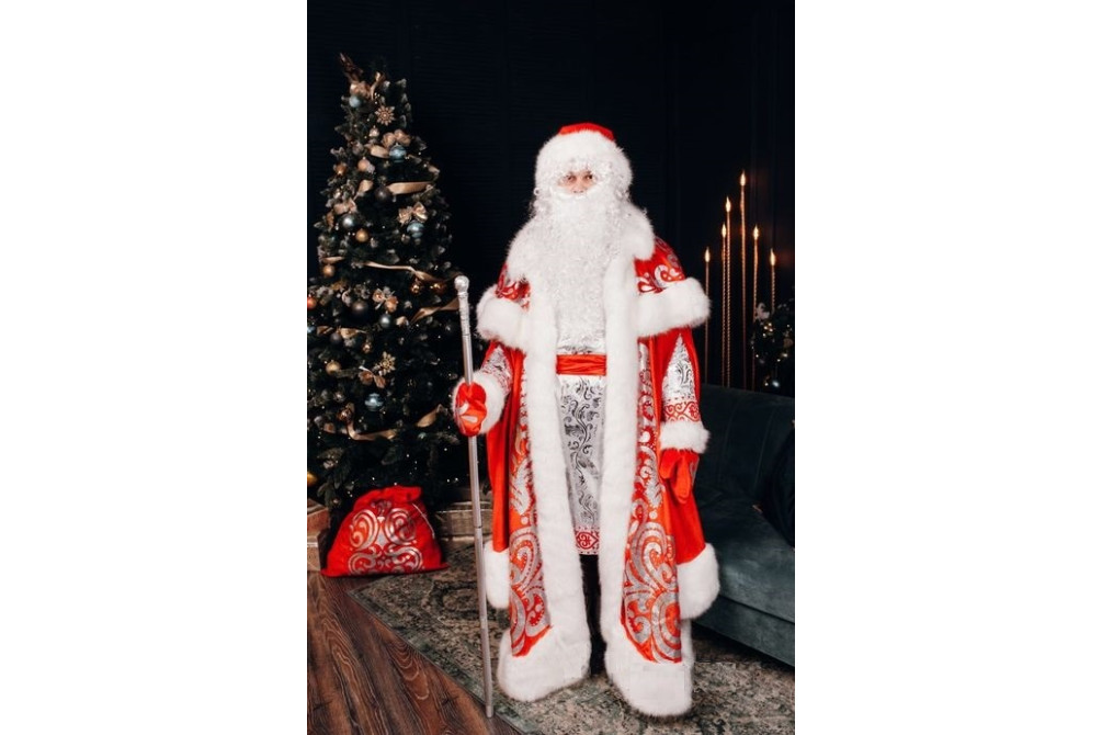 Костюм выполнен из бархатной ткани с отделкой из качественного искусственного меха. В комплект костюма входит красная шуба, украшенная аппликацией и белоснежной меховой отделкой. Рукава выполнены в красном цвете с золотыми узорами из текстильной ткани и вторые рукава длиннее обычных красного цвета из бархата с меховой отделкой. Красные бархатные варежки, парик белого цвета с кудряшками, густая белоснежная кудрявая борода и красный бархатный мешок.