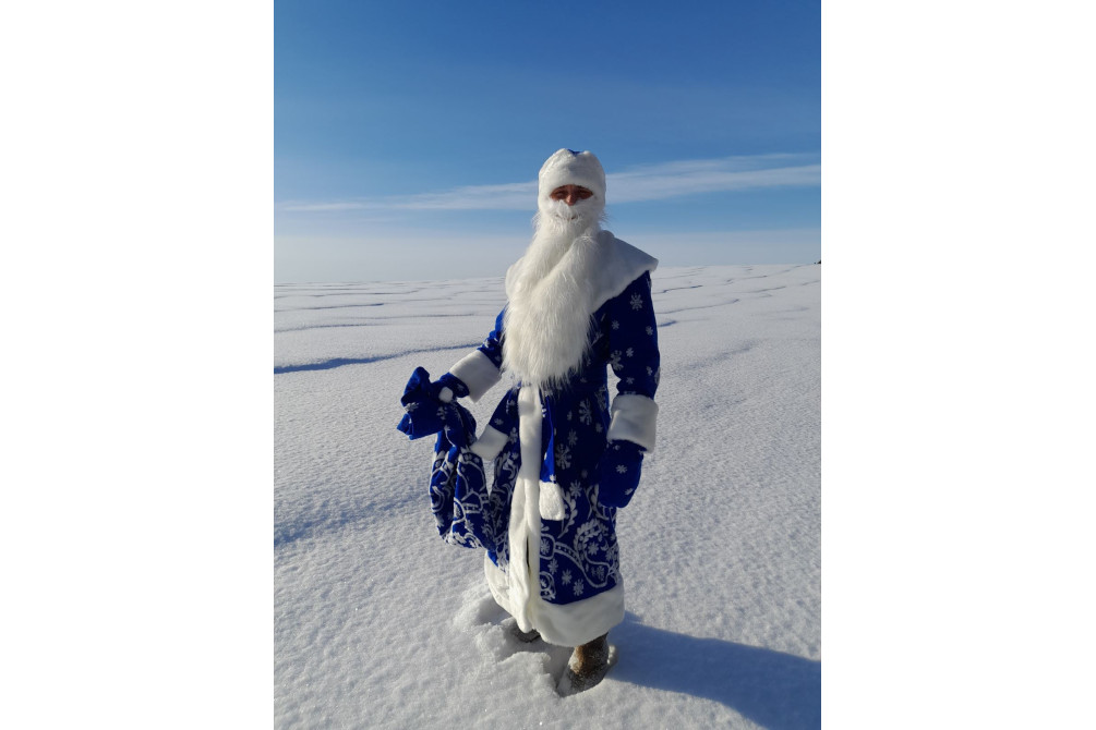 В комплекте Деда Мороза: пальто, шапка, пояс, рукавицы, борода, мешок.