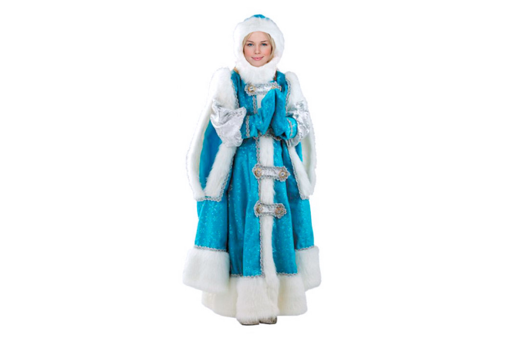 Голубая шубка-кафтан сложного кроя юной барыни по краям оторочена белым искусственным мехом, украшена морозными узорами и изящными застежками, а шапочка в тон шубе завершает образ хозяйки праздника.