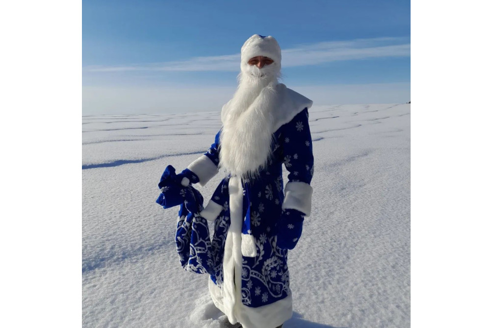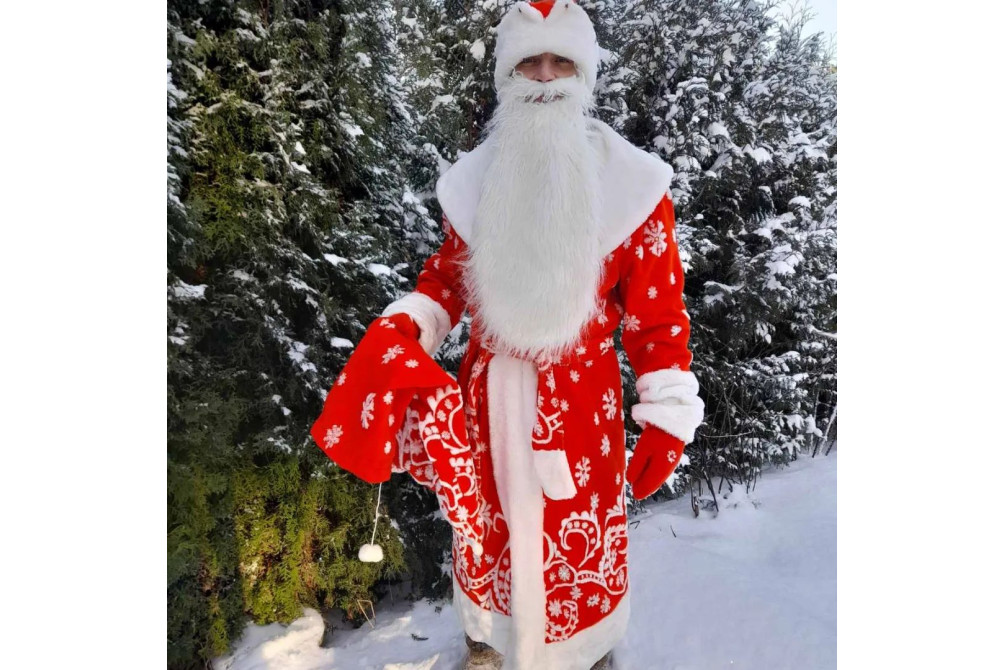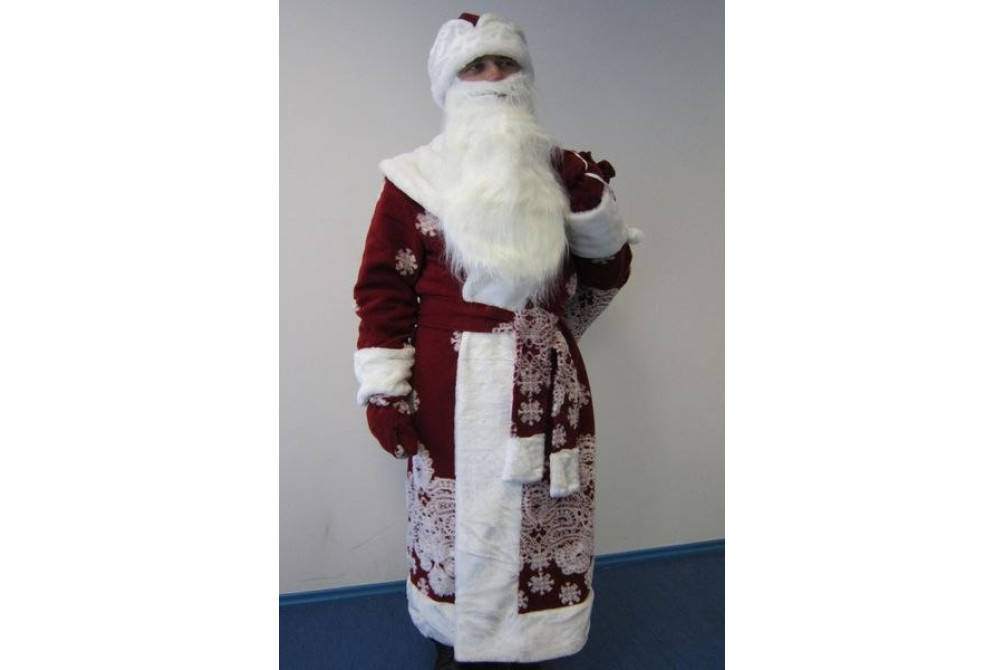 В комплекте Деда Мороза: пальто, шапка, пояс, рукавицы, борода, мешок,чехол для хранения.