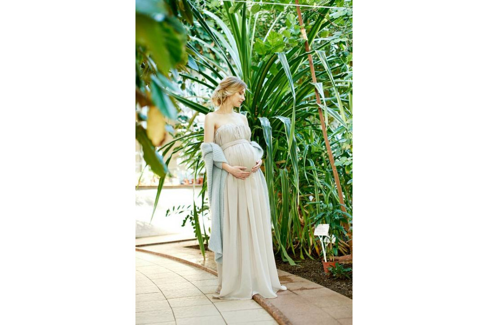 Размер: 42-48. Легкий воздушный пеньюар для беременных в пол из шифона серого цвета. В дополнение к образу имеется кардиган ручной вязки серо-голубого цвета, Рукав длинный. Комплект идеально подходит для съемки "В ожидании чуда".