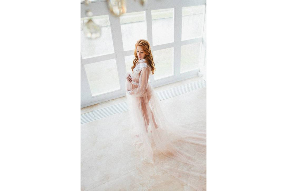 Платье-пеньюар из легкого и воздушного шифона. Нежно-розового цвета с отделкой из кружева. Идеально подойдет для фотосъемки беременности.