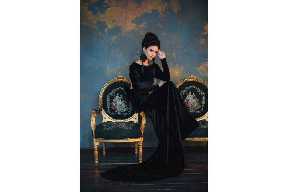 Размер: 42-46. Роскошное бархатное платье черного цвета в пол с длинным шлейфом. Спинка украшена блестящими стразами. В дополнение образа имеется бант съёмный!