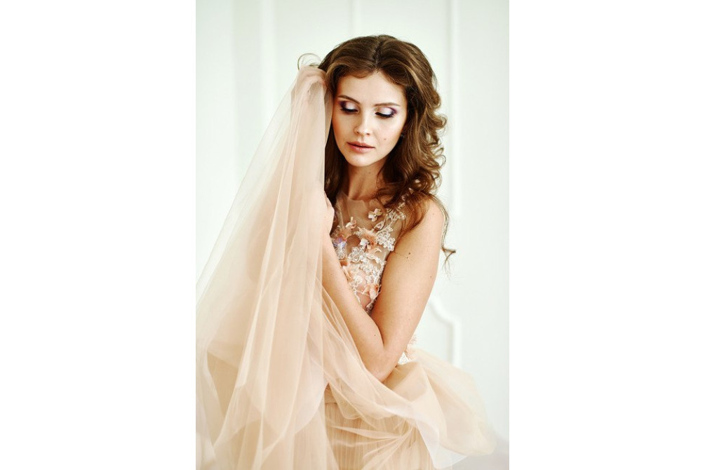 Размер: 42-48. Воздушное дизайнерское платье цвета карамели в единичном экземпляре. Верх платья украшен цветами ручной работы. Юбка из легкого фатина, с разрезом от бедра.