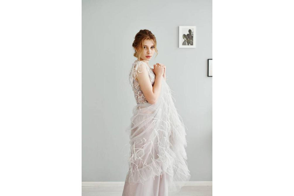 Размер: 42-46. Эксклюзивное дизайнерское платье светло-дымчатого цвета из воздушного фатина. Украшено набивным рисунком и пером, которое сделает ваш образ невероятно нежным и неповторимым.