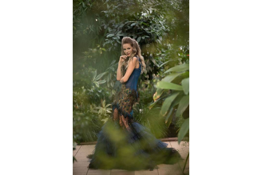 Размер: 40-44. Эксклюзивное дизайнерское платье в пол синего цвета с пышным шлейфом. Вверх платья дополняет жилетка, украшенная пером павлина и страуса, расшитая бусинами и пайетками. Юбка сшито воздушными клиньями из фитина, расширена к низу.