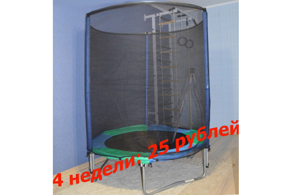 Представляет собой устойчивый металлический каркас на 3 изогнутых ножках с диаметром прыжковой зоны 140 см, с защитной сеткой высотой 180 см. Боковой лаз закрывается на молнию, чтоб ребёнок был в полной безопасности.