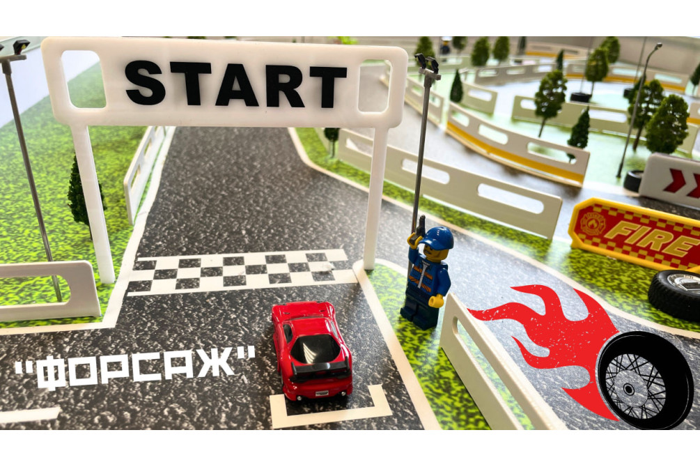 Гоночная трасса, с подсветкой, различными скоростными участками оформлена и стилизована под настоящий гоночный трек.