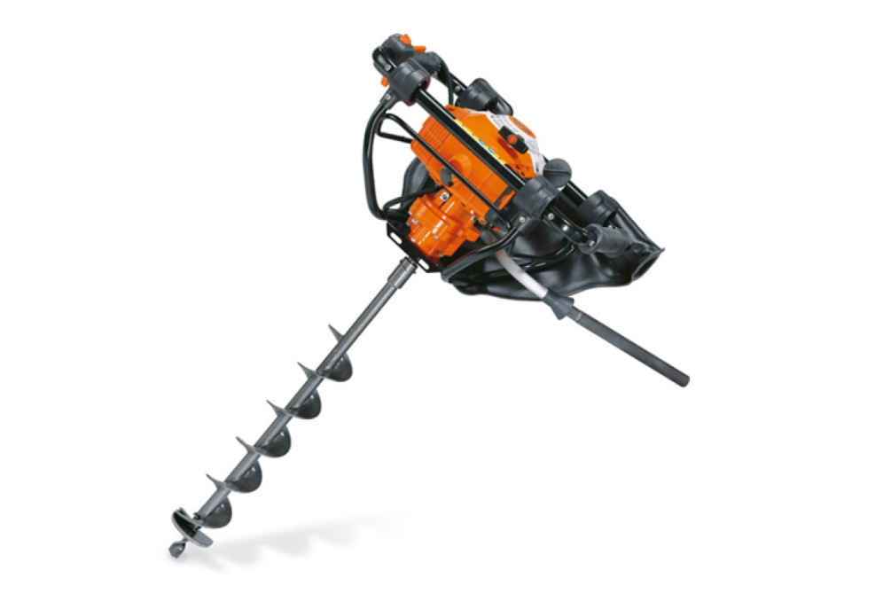 Система быстрого торможения QuickStop. Мощность 1,3кВт/ 1,8 л.с. Рабочий объем 30,8 см3. Диаметр бура до 200 мм. Глубина бурения до 120 см. Вес 9,4 кг.