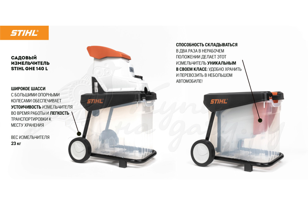 Встроенная емкость для измельчаемого материала/ Прозрачный контейнер для мусора встроен в электрический измельчитель. Объем до 60 литров вырезок. В целях безопасности садовый измельчитель STIHL не включается, пока емкость не будет правильно вставлена в устройство.