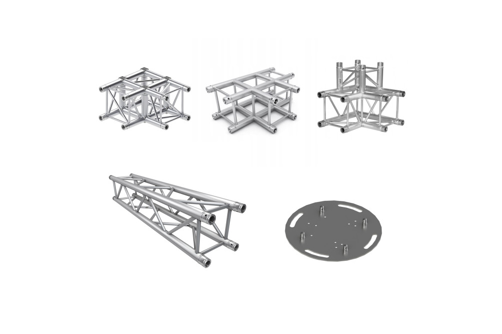 У нас есть фермовые конструктивы различных форм и размером: прямые фермы 0,3х0,3см длинной 0,5м, 1м, 2м; угловые и Т-образные фермы.