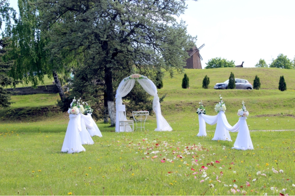 Полный комплект для выездной регистрации: разборная мателлическая арка из 6 элементов, кованный стол со стеклянной столешницей, деревянный белый стул, 6 металлических разборных стоек. Стоимость указана только оборудования, без оформления. Залог. Самовывоз. Самовозврат.