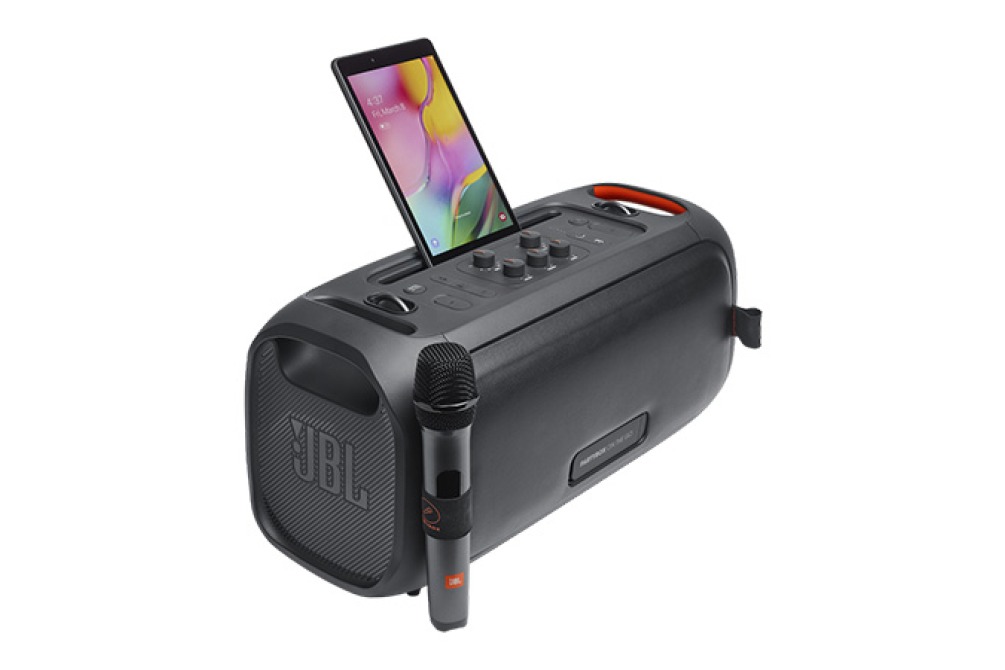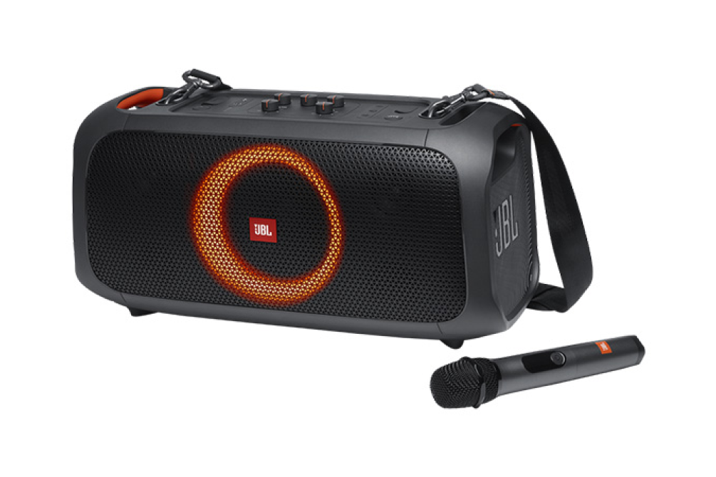 JBL PartyBox On-The-Go — это целая вечеринка на выезде: с мощным звуком, синхронизированным световым шоу, заряжаемым аккумулятором, ремнем и беспроводным микрофоном, а также дополнительными микрофонным и инструментальным входами.