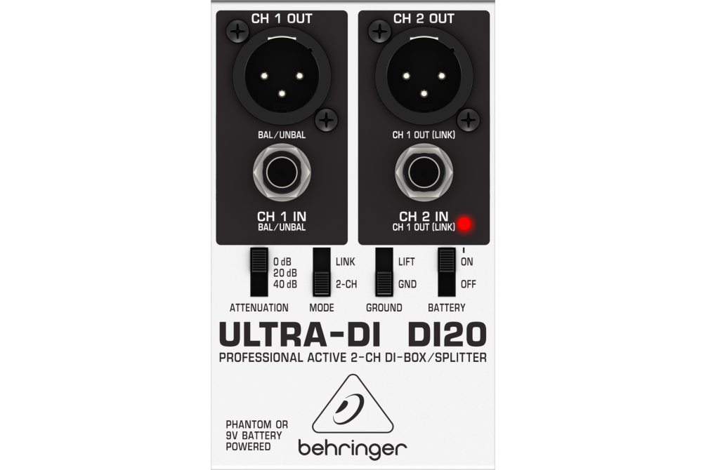 Переключая свитч, вы можете использовать DI20 для старта двух раздельных моно-сигналов, стерео-сигнала или разделенный сигнал для подачи на два раздельных усилителя. Ди-бокс также оснащен превосходным переключателем заземления и 3-х уровневым аттенюатором, для подъёма входного уровня до +48 дБ. Этот удобный аттенюатор позволяет подключаться прямо к кабинетному выходу усилителя с мощностью до 3000 Вт. DI20 питается как от 9-вольтной батарейки, так и от фантомного питания микшерного пульта (от +18 до +48 Вольт). Все это умещается в компактном, прочном металлическом корпусе.