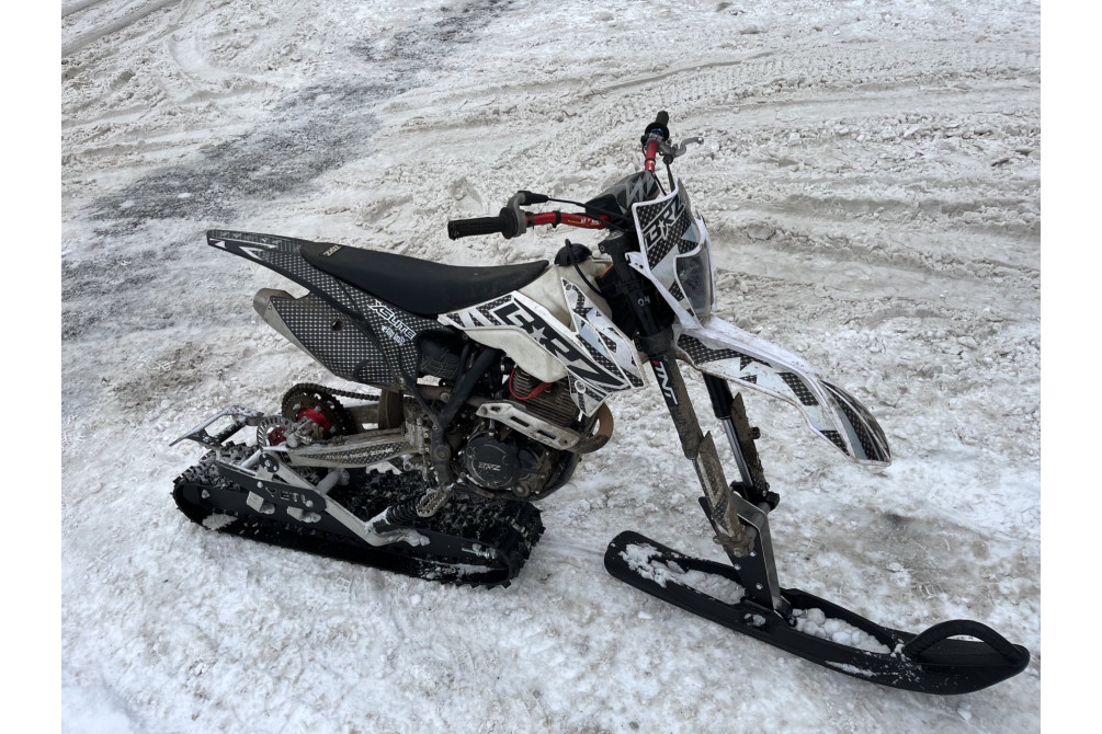 Сноубайк - это эндуромотоцикл оборудованый гусеничным приводом на заднее колесо и лыжей вместо переднего колеса.
