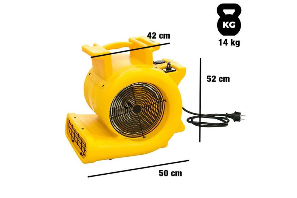 Горизонтальное расположение выдува (улитка) обеспечивает «низкую» подачу воздуха и направляет его непосредственно на обдуваемую поверхность, что эффективно при сушке влажных материалов, различных напольных покрытий, будь это мокрый ковер или только что залитый монолитный пол. Вентилятор создает поток воздуха в 2640 кубометров в час.