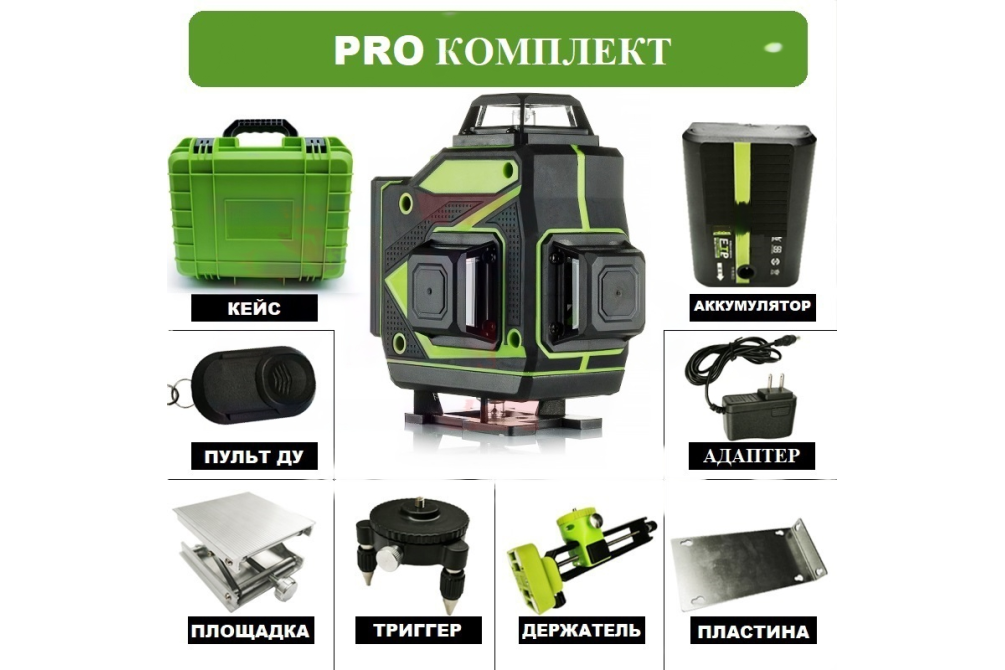 Прибор оснащен зелеными немецкими LD лазерами компании OSRAM. Строит 4 замкнутые плоскости (16 линий), из которых 2 вертикальных и 2 горизонтальных, все по 360°. Горизонтальные и вертикальные линии пересекаются под углом 90° (образуются «кресты») как на стенах, так и на полу с потолком. Точка пересечения линий на потолке соответствует точке на полу и служит отвесом. Линии можно по отдельности включать/выключать (в уровне четыре лазера).Прибор оснащен функцией работы под наклоном (возможность работы маятникового механизма для построения диагоналей и наклонных линий в разблокированном состоянии). Также визуальной сигнализацией отклонения от вертикальной или горизонтальной плоскости. Прибор может питаться от литий-ионного аккумулятора (Li-ion) (емкость 5800mAh) который входит в комплект.