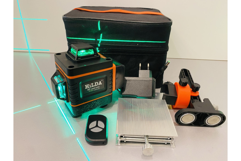 Лазерный уровень / нивелир Hilda 4D самовыравнивающийся нивелир с зеленым лазером, который осуществляет замеры в четырех взаимоперпендикулярных плоскостях. Используется при монтаже канализации, направляющих для обшивки, установке подвесных потолков, мебели. Предусмотрена опция выбора и блокировки необходимых рабочих линий по вертикали и горизонтали. Усовершенствованные диоды с серебряным покрытием позволяют использовать инструмент при ярком солнце. Длина волны лазера составляет 532 nm, дальность - 25 м. Превышение допустимого угла наклона будет сопровождаться быстрым миганием лазерных линий и прерывистым звуковым сигналом. Такая звуковая и визуальная сигнализации служат предупреждением некорректной разметки. Для отключения сигнализации необходимо просто поправить нивелир или поставить его на более ровную поверхность.