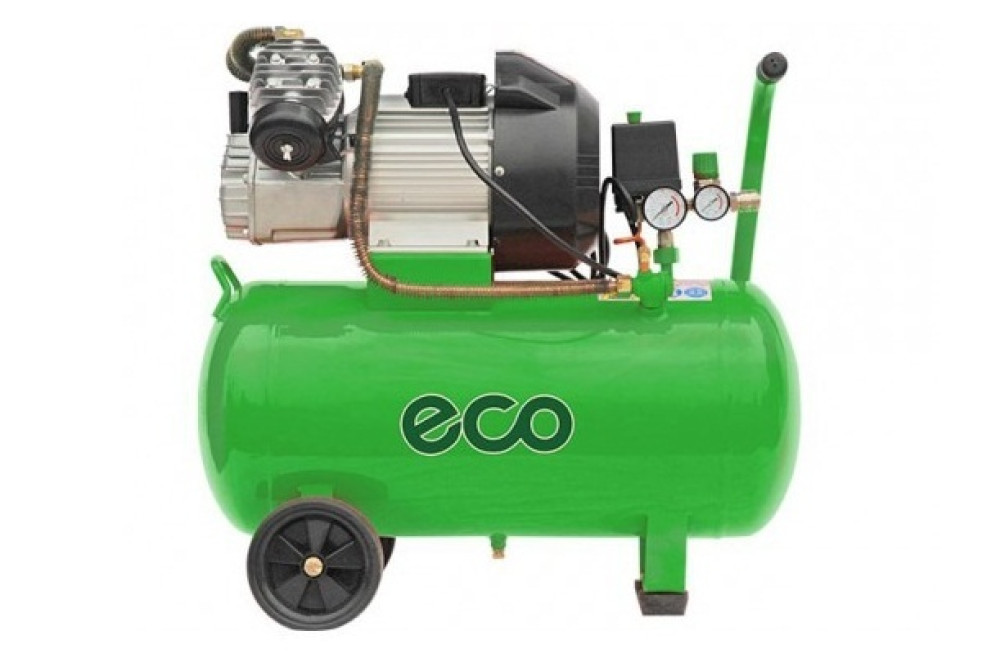 Компрессор ECO AE 502 предназначен для пневмоинструмента, паспортные характеристики которого соответствуют выходным данным. Оборудован предохранительным клапаном, который срабатывает при неправильной работе реле давления. Имеет 2 конденсатора: один стартовый (для облегченного старта даже при холодных погодных условиях) и второй для постоянной работы. Увеличенный масляный картер, для лучшей смазки и отвода тепла от поршневой группы. Тепловая защита двигателя. Регулировка давления на выходе. 2 манометра. Тип — поршневой. Тип смазки масляный. Ресивер 50 л. Потребляемая мощность 2,2 кВт. Производительность на выходе 380 л/мин. Производительность на входе 448 л/мин. Напряжение 220 В. Макс. давление 8 атм. Вес 50 кг.