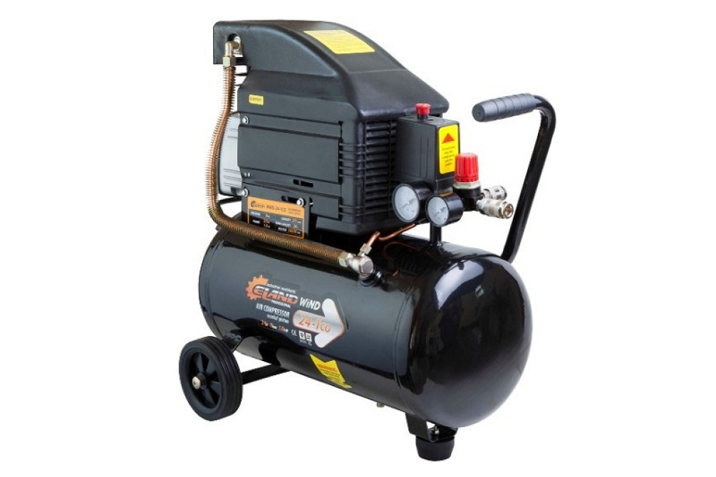 Напряжение 220 В. Мощность 1,5 кВт. Ресивер 50 литров. Давление 8 бар. Прямой привод. Радиатор охлаждения. Производительность 206 л/мин. Тепловая защита двигателя. Регулировка давления на выходе. Два манометра. Два быстросъема с латунным клапаном. В комплекте масло, воздушный фильтр, колеса для перевозки.
