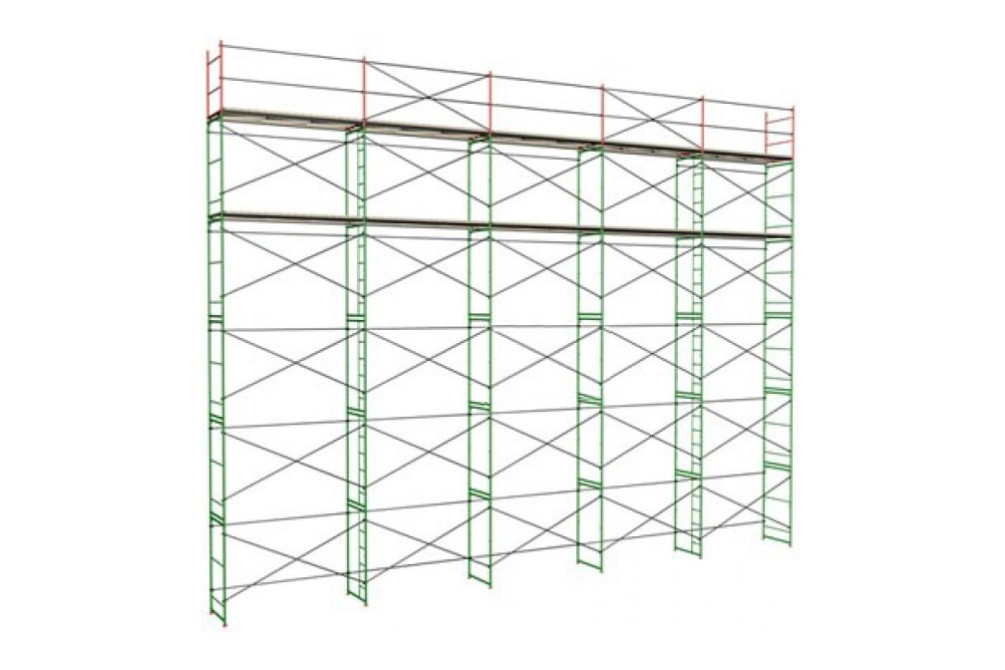 Леса рамные строительные РИЗ ЛРСП — 30 Материал — сталь. Нагрузка на настил 200 кг. Диаметр трубы 42 мм. Толщина стенки трубы 1,35 мм. Установка без инструментов. Достигаемая высота 30 м. Ширина рабочей площадки 100 см. Шаг яруса 2 м. Шаг рам вдоль стены: 2 м, 2,5 м, 3 м. Максимальное количество одновременно укладываемых на леса ярусов настилов: 2. Бесплатная доставка заказа на сумму от 30 рублей.