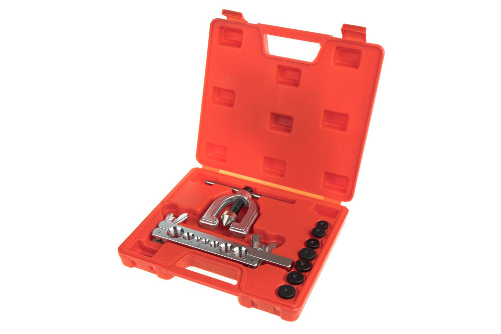 Набор для развальцовки трубок. Набор предназначен для односторонней и двусторонней (двойным конусом) развальцовки медных, алюминиевых и мягких стальных трубок тормозной системы под углом 45. В состав набора входит зажимная планка, винтовая скоба с конусной насадкой и семь сменных пуансонов для трубок диаметром от 4.8 до 12.7 мм. Конусный наконечник изготовлен из легированной стали для снижения трения. Винтовая скоба изготовлена методом горячей штамповки (ковки на молотах) из хром-ванадиевой стали. Возможна развальцовка типов D, E (SAE) и F (ISO).