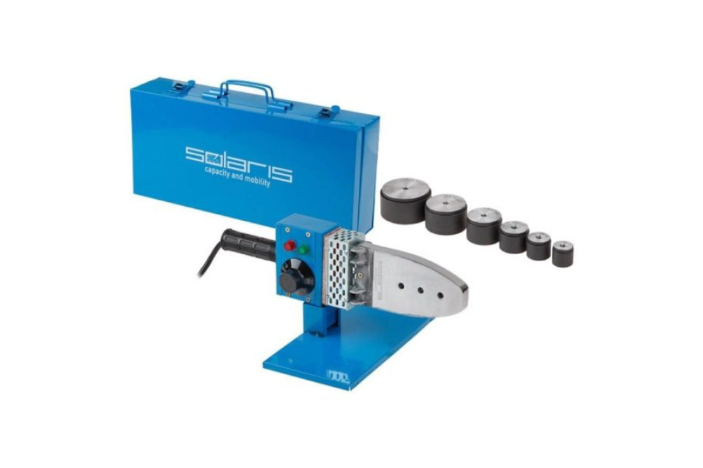 Сварочный аппарат мощностью 1000 Вт с регулировкой температуры и оснащенный 6-ю насадками от 20 до 63 мм — оптимальный выбор для проведения разнообразных сантехнических работ.