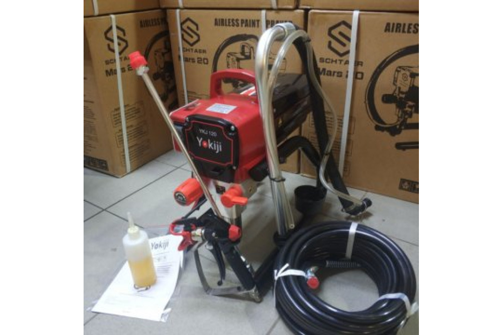 Безвоздушный окрасочный аппарат YOKIJI YKJ 120 профессиональный и компактный окрасочный аппарат, работает по принципу безвоздушного распыления.