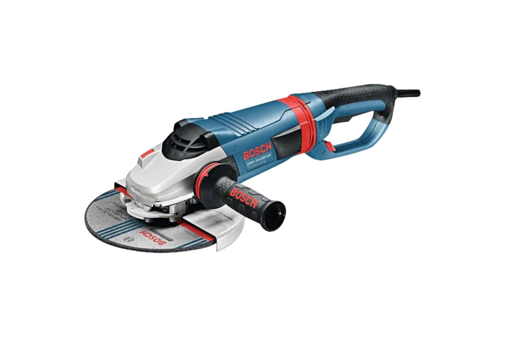 BOSCH GWS 24-230LVI- профессиональная двуручная тяжелая (5,5 кг) угловая шлифмашина мощностью 2400 Вт с максимальным диаметром устанавливаемого круга 230 мм. Плавный пуск обеспечивает включение без рывков, блокировка шпинделя упрощает замену диска. Защита от непреднамеренного включения предотвращает самопроизвольный запуск инструмента после прерывания подачи тока. Имеет специальную виброгасящую конструкцию, уменьшающую уровень вибрации на 70%.