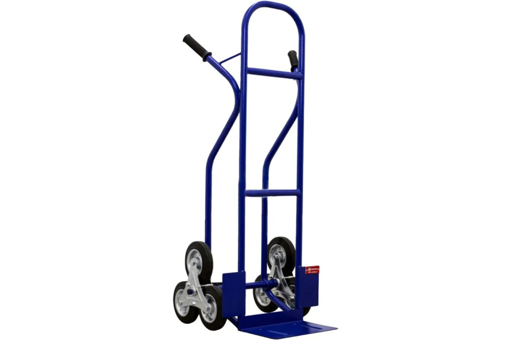 Главное преимущество двухколесной грузовой тележки КГЛ 200 — транспортировка груза по лестничным маршам. Тележка изготовлена из труб круглого сечения, платформа имеет отштампованные ребра жесткости, что обеспечивает заявленную грузоподъемность в 200 кг.