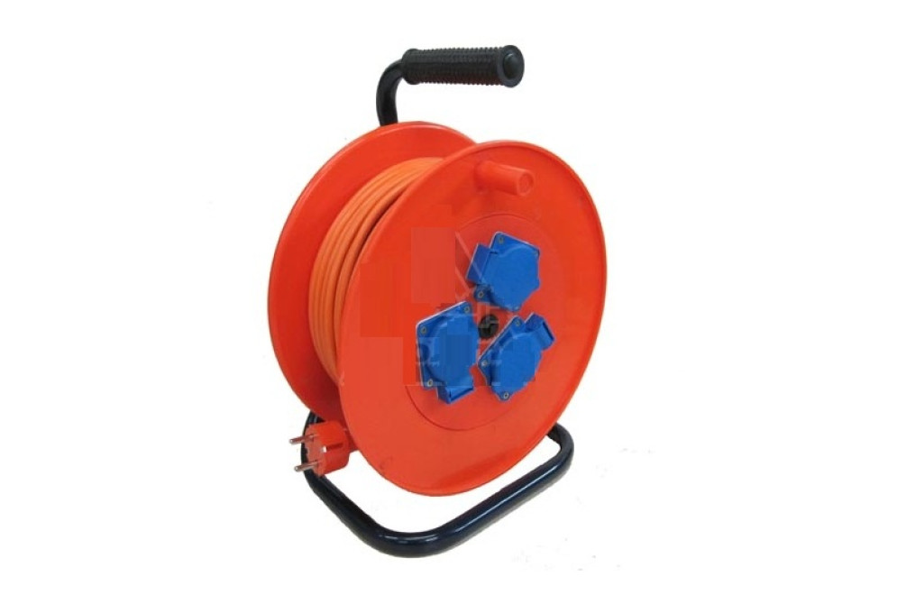 Пластиковая катушка с тремя розетками. Длина провода 50 м. Сечение провода 2 х 1,5. Допустимый ток 16 А. Допустимая мощность 3000 Вт.