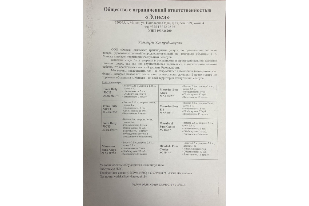 Оказываем транспортные услуги по организации доставки товара (продовольственный/непродовольственный) по торговым объектам в г. Минске и по всей территории Республики Беларусь.Так же в нашем автопарке имеется автомобиль оборудован системой холодильного охлаждения.