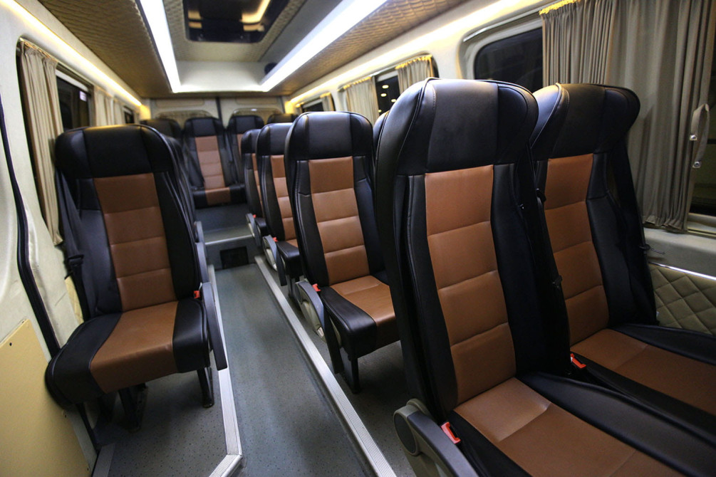 VIP салон. 17 Мест. Кондиционер. Откидные сидения. Тонированные стекла. Ремни безопасности. Отопитель салона. Кожаный салон. Прицепное устройство. Багажное отделение. Цена за 1 час / 1 км от 15 $ / 0,5$