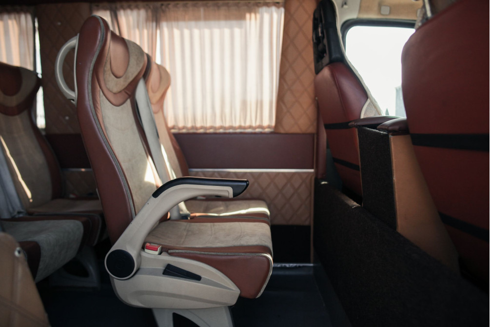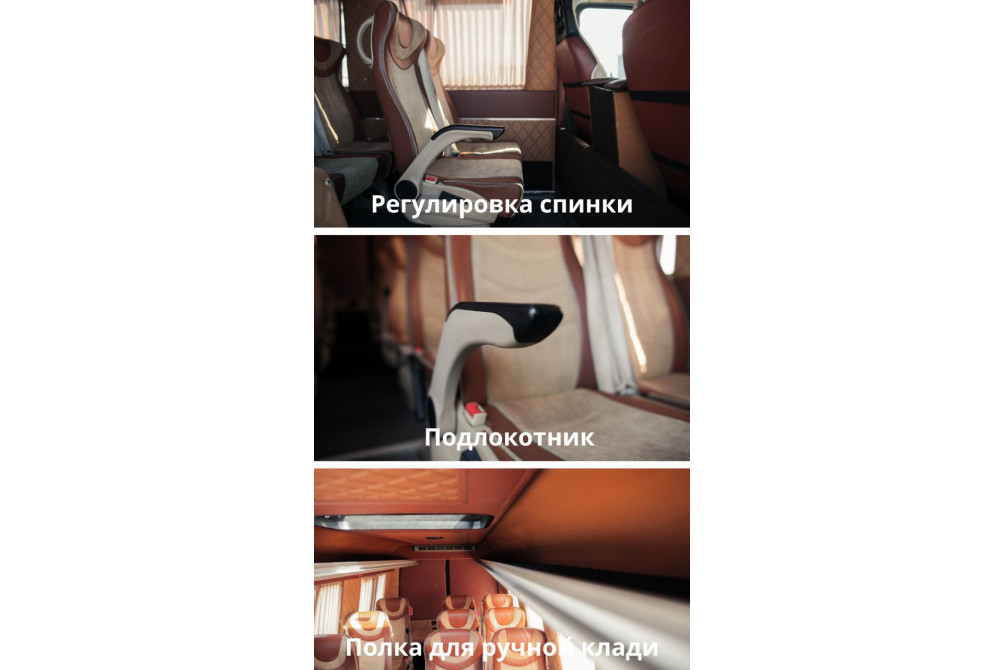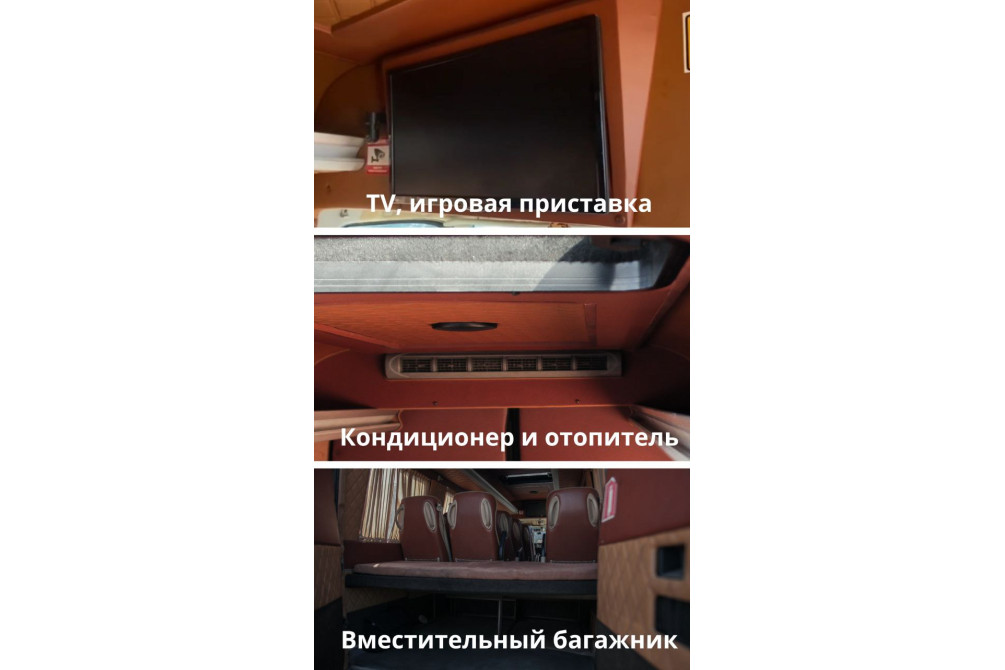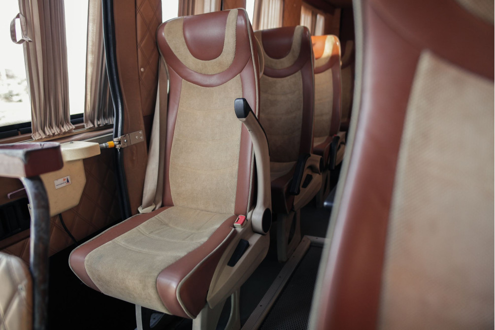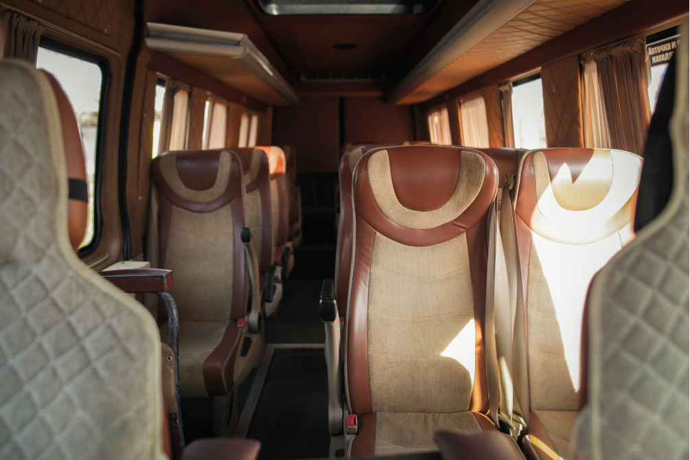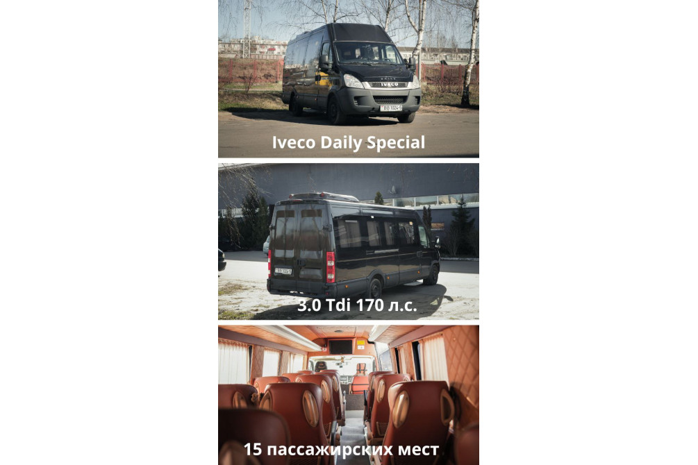 Iveco Daily Special с мотором 3,0 Td и 200 л.с. идеально подходит для вашего перемещения в пространстве и времени. Сдвижная электродверь сделает выход и вход быстрым и лёгким. Комфортабельный салон имеет 15 раздельных сидений с регулировкой угла наклона спинки. Каждое сиденье оснащено подлокотником и трёхточечным ремнём безопасности. На всех окнах установлены солнцезащитные шторки, а каждому пассажиру доступна полка для ручной клади и просторный багажник. В автомобиле установлен кондиционер для пассажиров, а так же автономный отопитель (Webasto), для обогрева салона автобуса во время длительных стоянок. Для развлечения установлен телевизор с богатой коллекцией фильмов, игровая приставка Sega с более чем 5000 играми на 1-2 игроков, акустика Pioner для прослушивания любимой музыки.