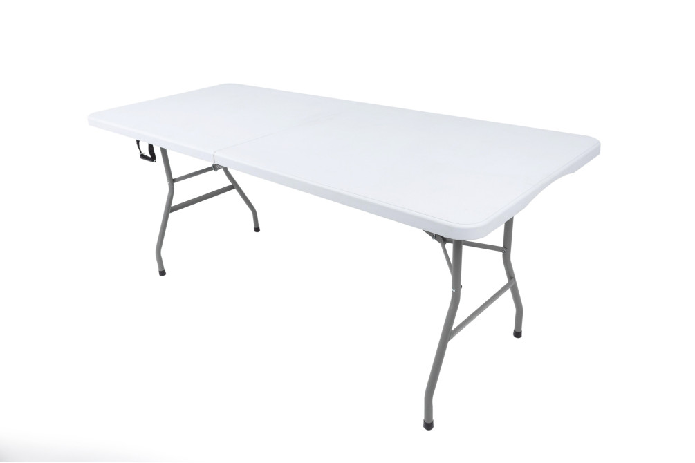 Складной металлический трубчатый каркас. Пластиковая столешница. Размеры: 180 х 75 х 74 см. Вес: 13,5 кг. Нагрузка: до 40 кг. Устойчив, компактен при транспортировке.