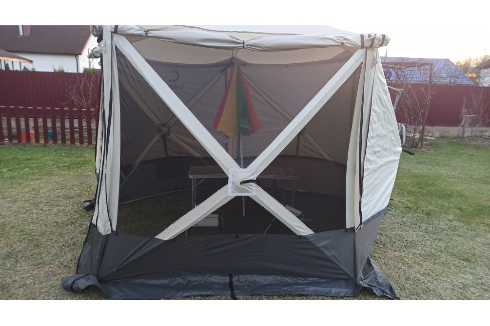 Широкая ветрозащитная юбка 25 см; На каждой стороне шатра расположены большие окна защищенные москитной сеткой с мелкой ячейкой. В случае осадков москитная сетка закрывается сплошными стенками;
